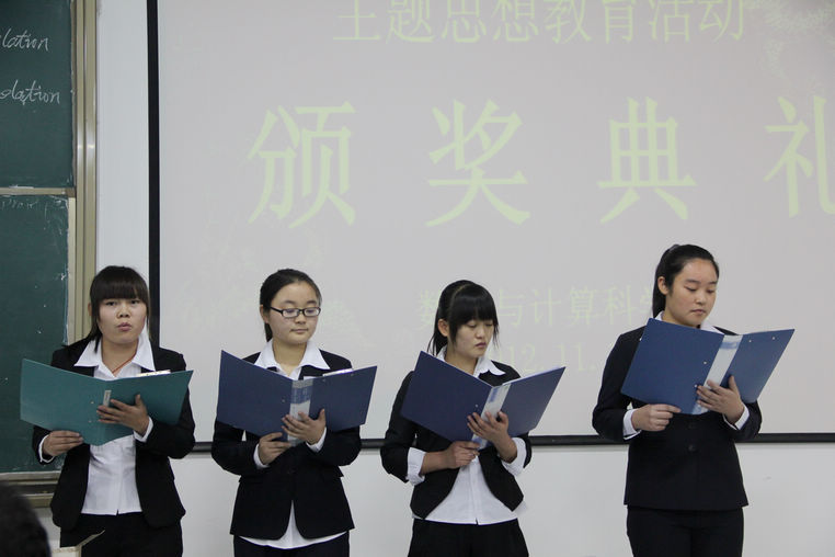 主题思想教育活动是根据院学生处的安排结合我系专业特色而进行的一项具有深刻意义的思想政治教育活动,我系根据院学生处的文件精神,紧扣时代热点,先后组织开展了《大学生良好素质的自我培养》专题报告会、数学与计算科学系第四届双语教学技能大赛、迎十八大“爱我中华”配乐朗诵赛等系列活动,取得了良好的效果,涌现出了许多表现优秀的学生。颁奖典礼上,系领导和老师分别为教师技能大赛和配乐朗诵赛一、二、三等奖和优秀奖获奖选手颁奖,获奖同学分别作了汇报讲课和朗诵,李主任对同学们的讲课情况作了精彩点评,辅导员郭萌老师和全体师生一起学习了《商洛学院系级学生工作量化考核办法》,赵书记对我系学生管理工作作了总结讲话,勉励大家勤奋学习,全面发展,立志成才。