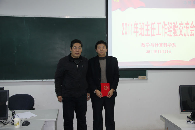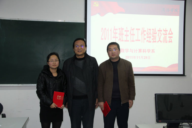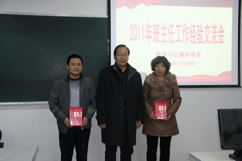 为强化班级管理,提高班主任工作的管理艺术,根据学生处统一要求,我系于2011年11月29日晚7:30在2号教学楼数学建模实验室举办了2011年班主任工作经验交流会,系主任李超老师、党总支副书记丁争尚老师、副主任赵健老师出席了交流会并担任评委。本次班主任经验交流会共有13位班主任老师分别就自己的工作做了交流发言,经评委评选,我系岳毅蒙老师荣获一等奖;程国老师、罗俊丽老师荣获二等奖;李粉红老师、孔亮老师荣获三等奖。会议结束时,系领导分别为获奖班主任颁发了荣誉证书。系党总支副书记丁争尚老师做了总结讲话,勉励大家相互学习,取长补短,共同做好我系的班主任工作。会后,系领导和班主任、辅导员、学生干部一起就冬季安全检查了我系全部学生宿舍。