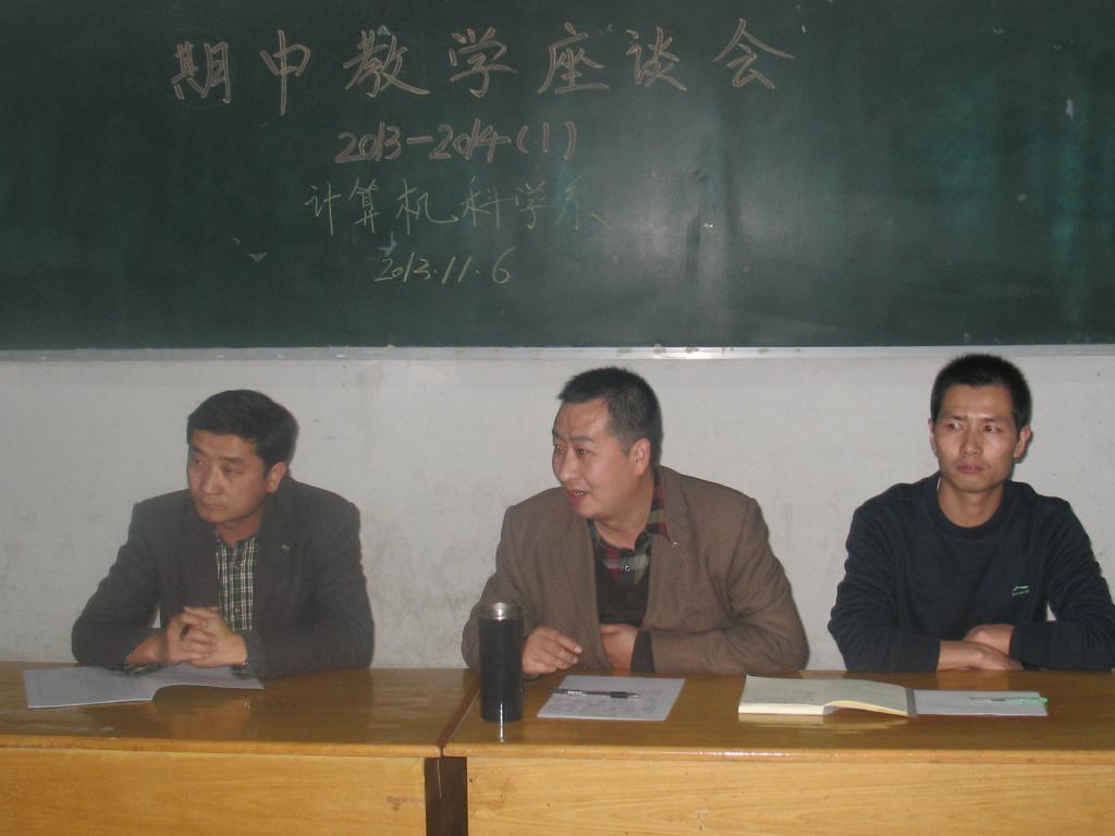 2013年11月6日晚19:30,计算机系分别在2-311和2-215教室举行以“教学中存在的问题及原因分析”为主题的期中教学座谈会,座谈会分专业课和公共课两组进行。2-311教室专业课座谈会与会教师有系教学主任刘爱军副教授,专业教研室主任韩波老师、屈正庚老师、教学秘书鱼先锋老师和计算机系各班学生代表。2-215教室全院计算机公共课座谈参会人员有公共教研室主任卢琼、赵建华、王重英、李艳、张燕等公共课教师代表以及来全校的二十四名学生代表。