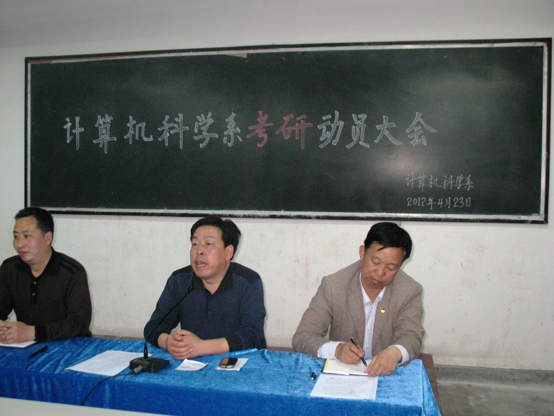 2012年4月23日晚19:30“计算机系考研动员大会暨考研学生座谈会”在323教室隆重举行。系领导樊景博、刘爱军、任康民与考研工作相关教师到会,我系计本09、10及专升本11共计113名学生参加动员会。