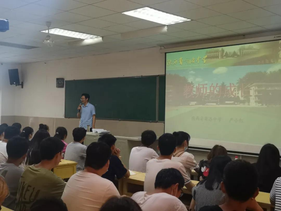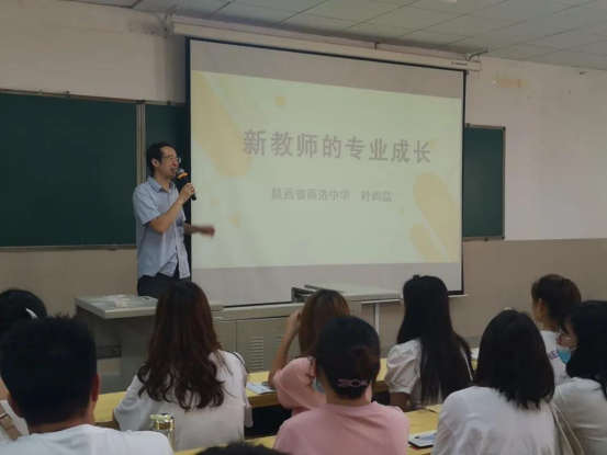 第一天听课观摩结束后,省级学科带头人、商洛中学数学教研组长叶昀喆老师为2019级实习生作了题为《新教师的专业成长》的专题报告。叶老师结合典型的数学教学案例从角色转换、教学技能、自我提升和反思总结等方面进行了详细的讲解。