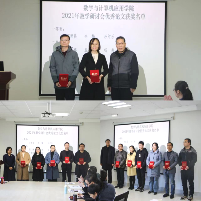 会上首先对学院2021年教育教学研讨会优秀论文进行了表彰,副院长王念良宣读了表彰决定,院长李超、教务处副处长张晓倩、副院长王念良为获得教学研讨会优秀论文的15位教师颁发了荣誉证书,希望受到表彰的老师再接再厉,在今后的工作中再创佳绩,要求全体教职工以受到表彰的老师为榜样,在教育教学工作中筑牢根基、勇于开拓、敢于创新,为提升学院教育教学质量做出贡献。