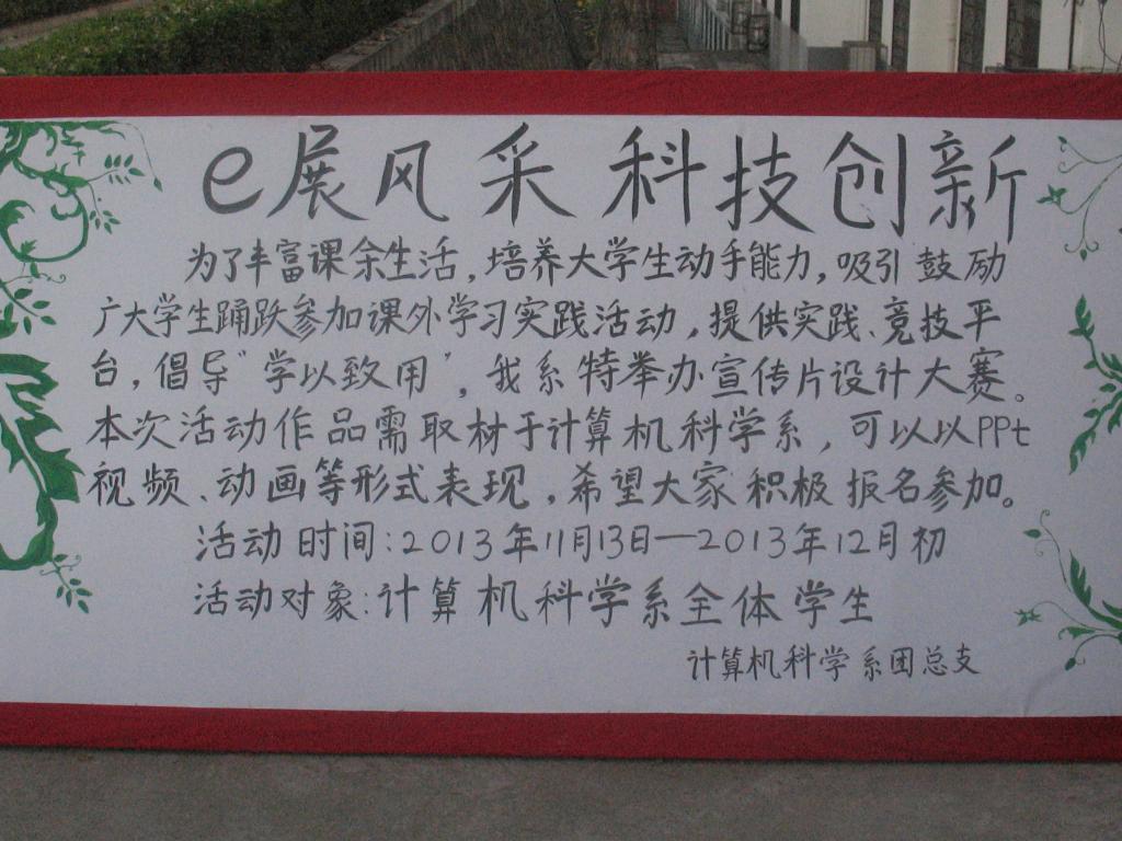 为提高学生的计算机应用技术水平,培养学生创新意识,提高学生实践能力,我系于11月中下旬面对全系学生举办了以“e展风采,科技创新”为主题的宣传片大赛。