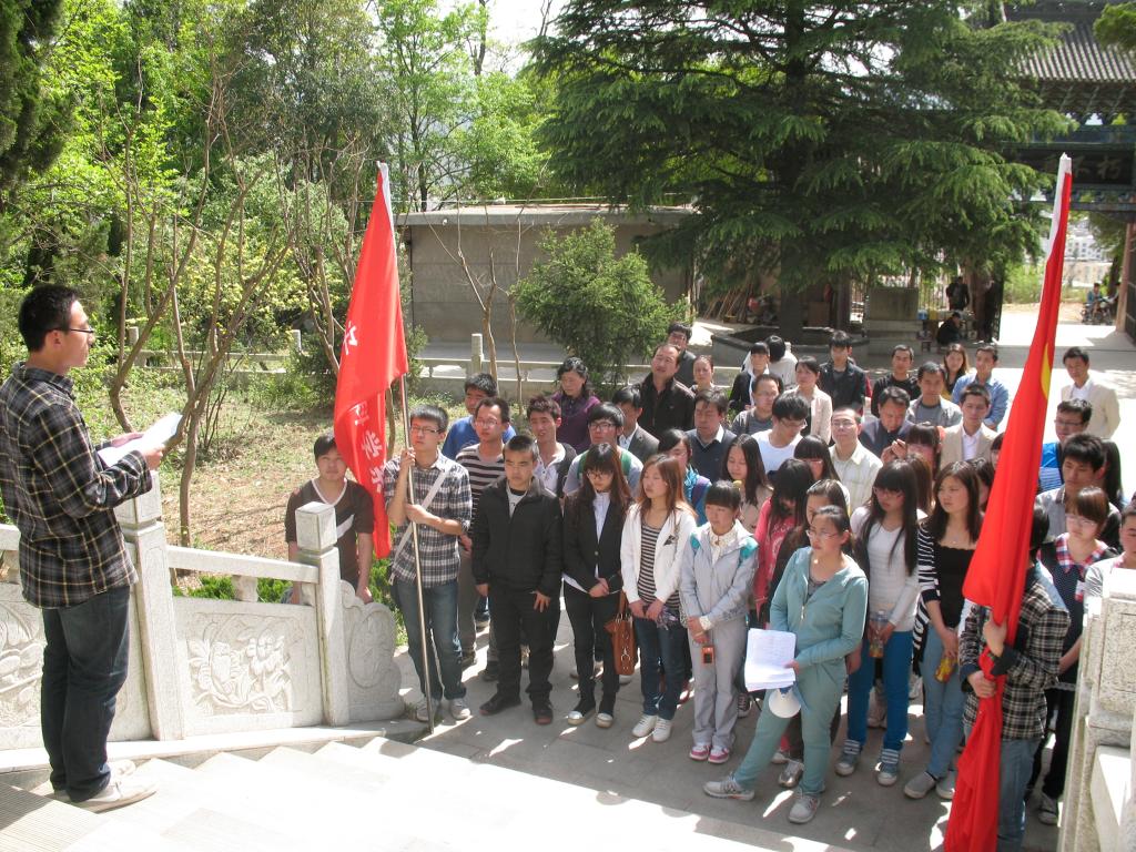 全体教师党员和学生党员、预备党员在陵园的人民英雄纪念碑前合影。
