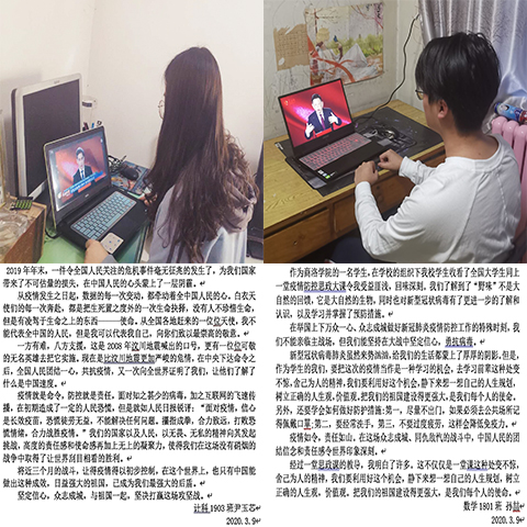为将高校思想政治理论课教学优势转化为支持抗疫斗争的强大力量, 3月9日下午2:30,我院全体师生通过网络直播共同收看了由教育部社科司与人民网联合组织的“全国大学生同上一堂疫情防控思政大课”。