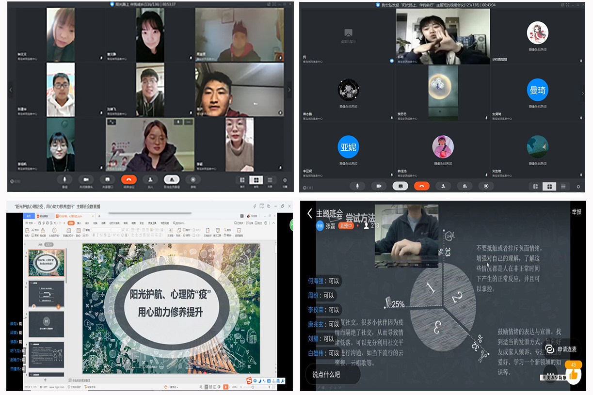 各辅导员首先向同学们介绍心理健康教育季的由来,使学生了解到“3.25” 是“善爱我”,“5.25”是“我爱我”,只有善待自己,爱自己才能更好地爱他人。其次,针对疫情防控期间学生的恐慌紧张、难以入睡、敏感多疑以及生活能力和学习效率的下降,各辅导员呼吁同学:疫情当前,要保持积极情绪,阳光心态,构筑坚实的心理防线,众志成城,共克时艰。从“信息、信心,心和、人和、身和”五个方面对学生进行心理调适,即理性获取权威信息,避免过度恐慌;相信科学,相信党和国家,建立信心;端正心态,理性平和,不抱怨;通过网络与朋友多联系,构建心理抗“疫”同盟;规律作息,合理饮食,休整身心。对于毕业班因疫情引起的就业难问题,辅导员一方面为学生开展心理疏导增强求职信心,另一方面对网申技巧进行教授,鼓励学生参加网络招聘会,努力提升学生就业能力。最后,各辅导员对我院心理健康教育季活动进行了宣传,并对班级参与情况进行安排部署。