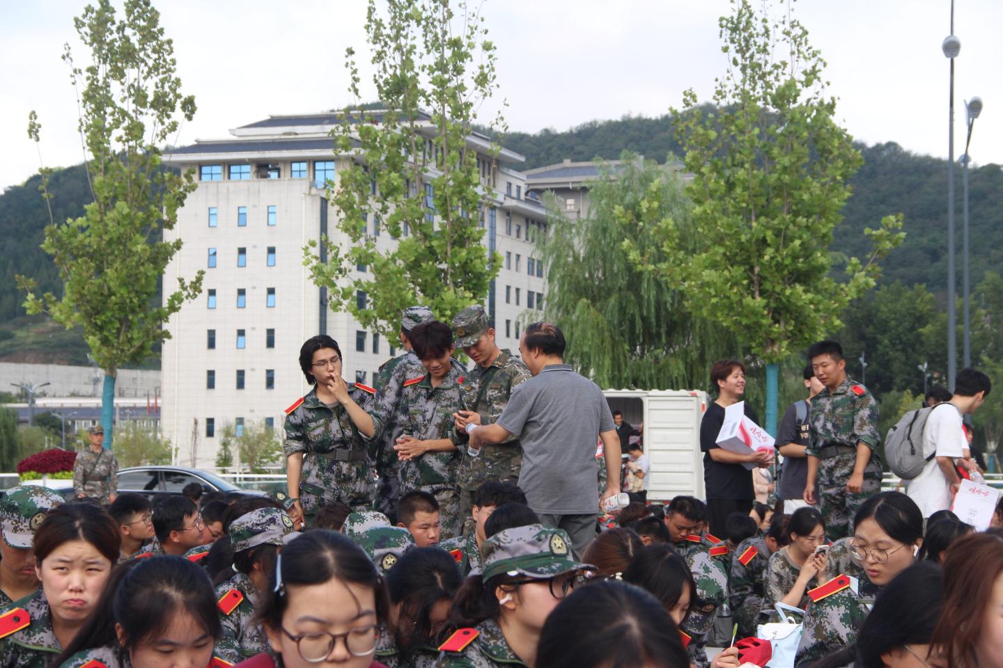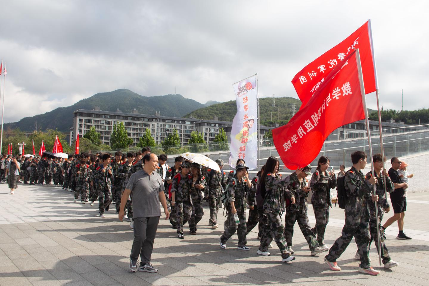 抵达目的地商鞅广场后,学院带队辅导员和志愿者贴心为同学们递上饮用水,叮嘱大家及时补充水分。随后,在教官的带领下,《强军战歌》的旋律在广场响起,我院师生齐声高歌,充分展现了全院上下的热血与朝气。