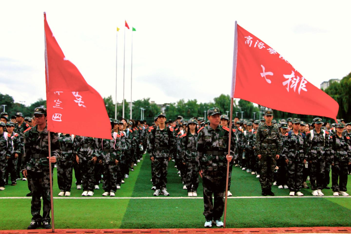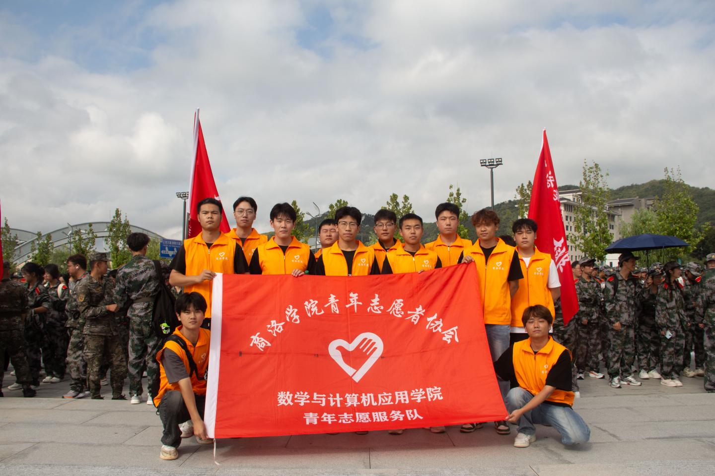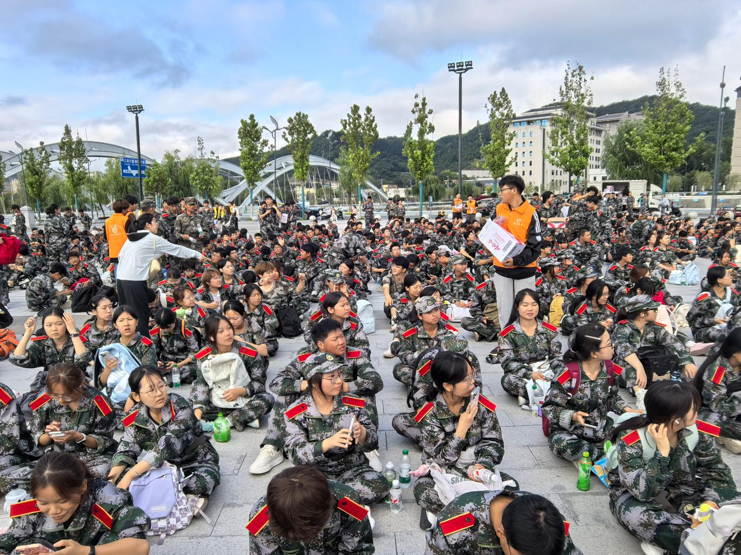 清晨六点,我院新生身着迷彩服,在操场集结完毕,整装待发。为保障路途安全,学院特地安排了15名身穿橘黄色志愿者马甲的同学作为应急力量,协助老师与教官维护秩序。