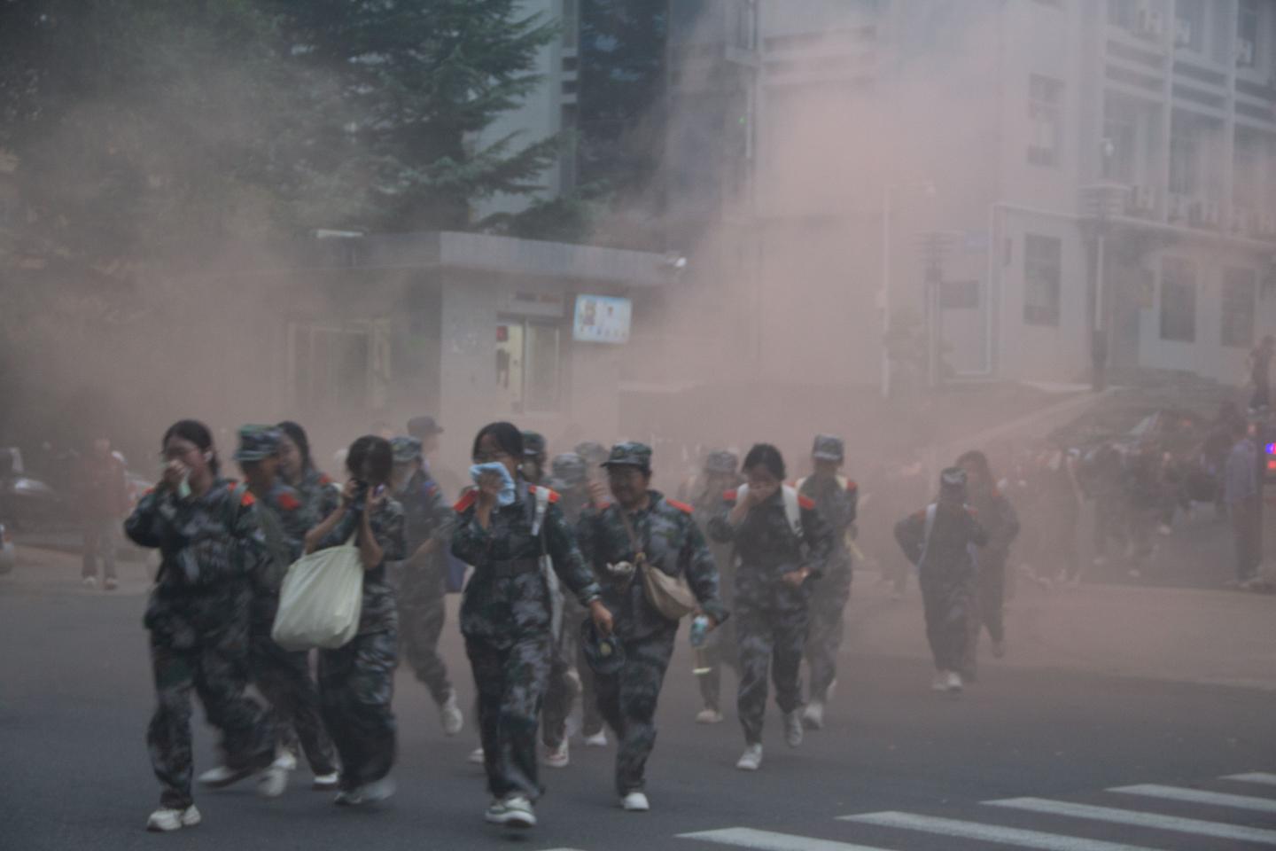 出发前,教官特意施放模拟硝烟,弥漫的烟雾瞬间营造出紧张的临战氛围,使学生们沉浸式体验了紧急行军的真实感。