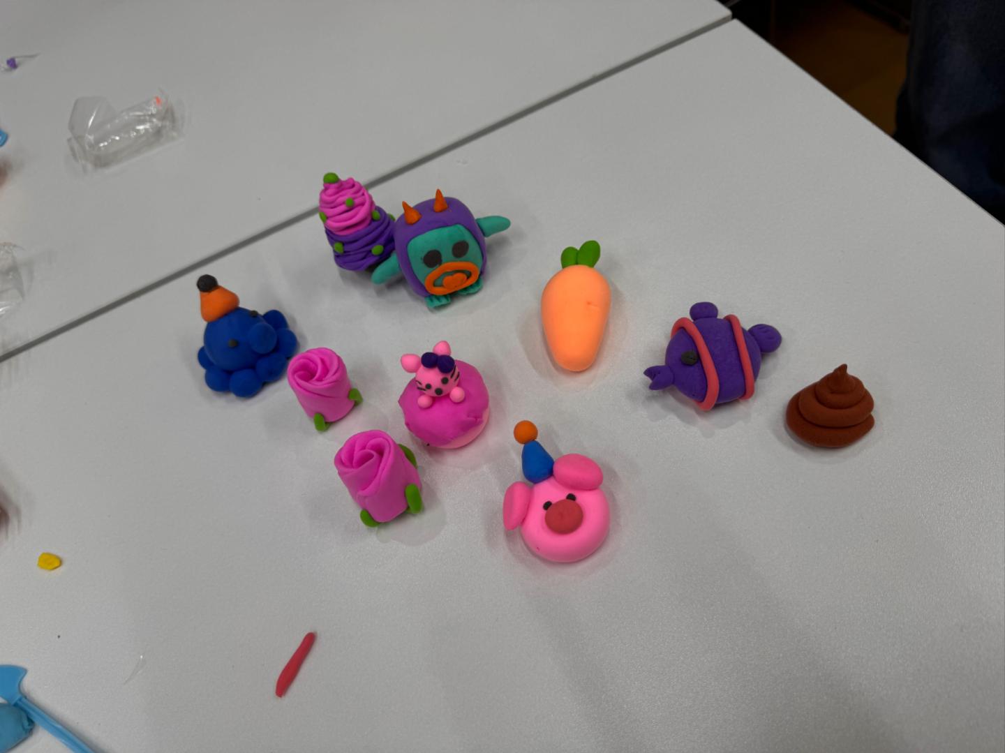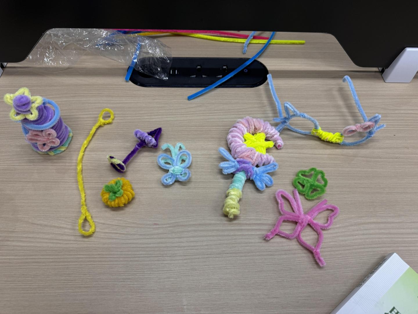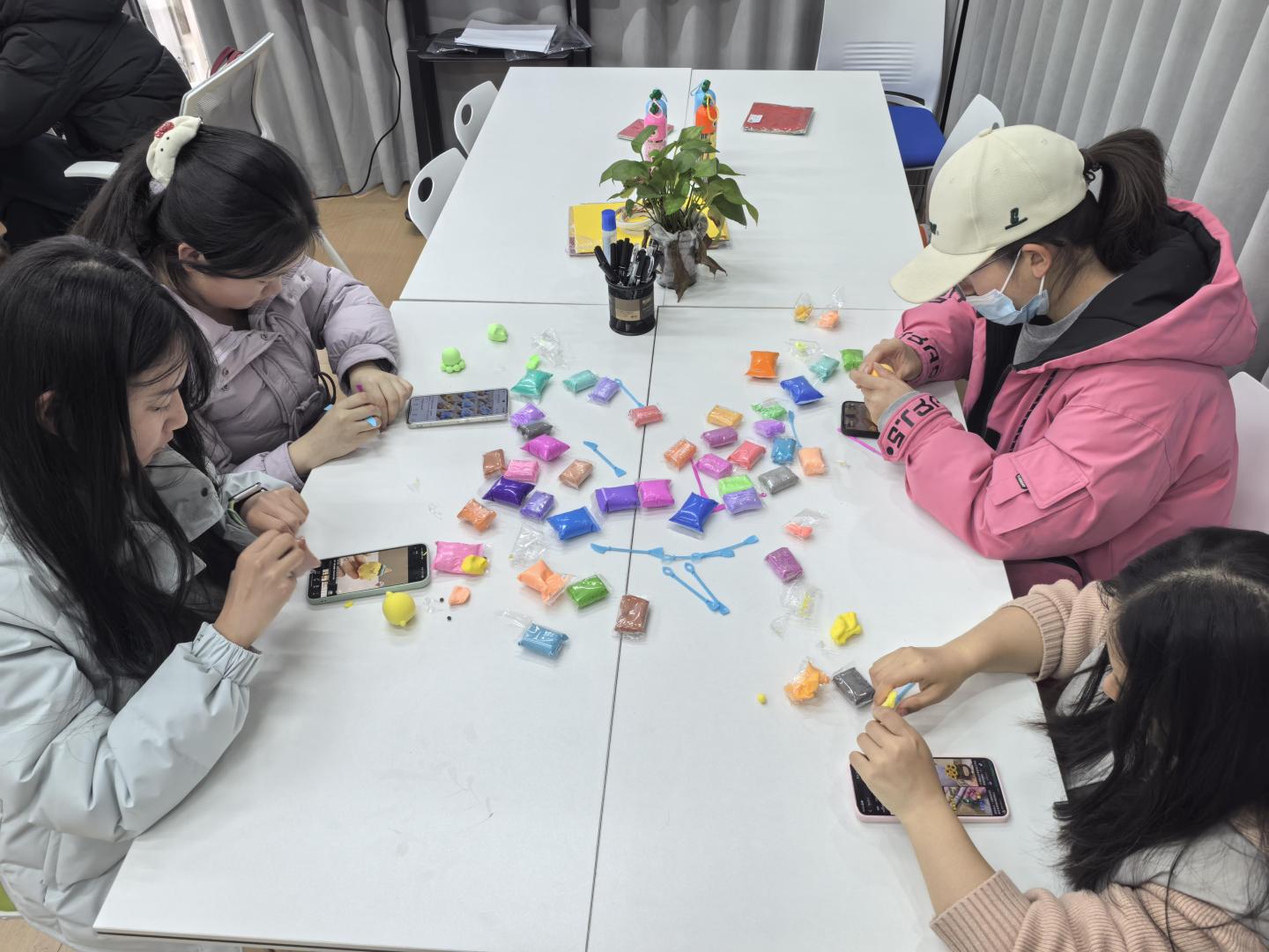 活动现场分设纸艺、彩泥两大创作区:纸艺区备齐彩色卡纸、剪刀,还鼓励大家用废旧宣传单、作业本空白页创作,同学们围坐折出风铃轮廓、粘贴立体贴画;彩泥区里,超轻黏土、装饰珠等材料摆开,单人细致捏塑、双人协作构思,轻柔音乐里,专注的氛围裹着创意慢慢升温。