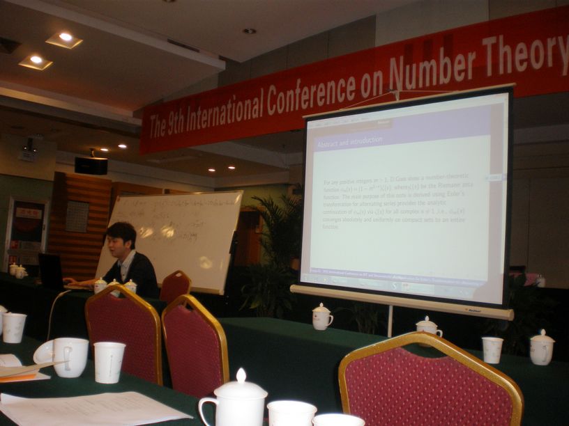 《第九届国际数论与Smarandache问题研讨会》于2013年3月29日至31日在汉中红叶大酒店召开。我系数学与应用数学专业10级(2)班同学李存璞参加了这次学术研讨会并作了题为《An Application On Euler’s Transformation for Alternating Series》的学术交流报告。李存璞同学以本科在校学生身份参加研讨会并作报告,在历届研讨会上尚属首次,受到了研讨会组织者的充分肯定。同时,李存璞同学参加国际学术会议也开创了我院学生参加国际学术会议的先河,为2015年我院本科教学合格评估奠定了基础。