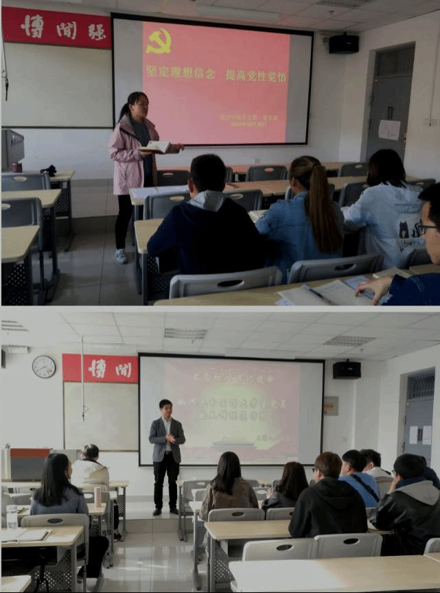 学生第一党支部书记赵萍主讲了《坚定理想信念、提高党性觉悟》,她指出要按照党员标准严格要求自己,坚定理想信念,提高党性觉悟,增强政治意识、大局意识、核心意识、看齐意识,严守党的政治纪律和政治规矩,勇于担当作为,在工作和学习中发挥先锋模范作用。学生第二党支部书记张磊主讲了《如何发挥大学生党员模范带头作用》,指出当代学生党员存在共产主义信念减弱、易受外界不良影响的干扰是我们发挥大学生党员先锋模范作用的障碍等问题,希望学生党员思想上要入党,立志报效祖国,在平时的学习、工作和生活中充分发挥当代大学生党员的先锋模范作用,在我院学生中起到榜样作用。