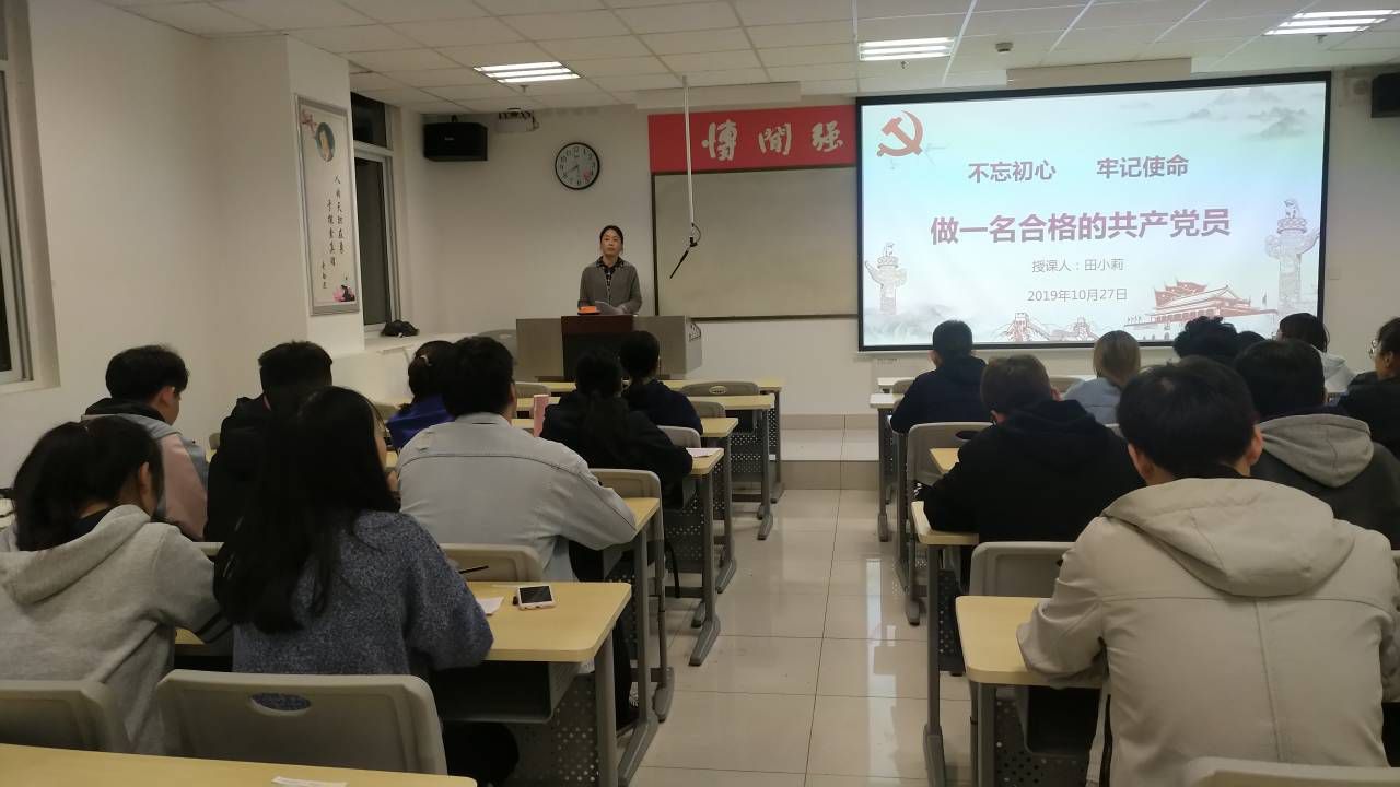 为推动我院学生党员“不忘初心、牢记使命”主题教育中往深里走、往心里走、往实里走。10月27日-10月30日,党总支书记田小莉、学生党支部书记赵萍、张磊先后为我院学生党员讲授了专题党课。