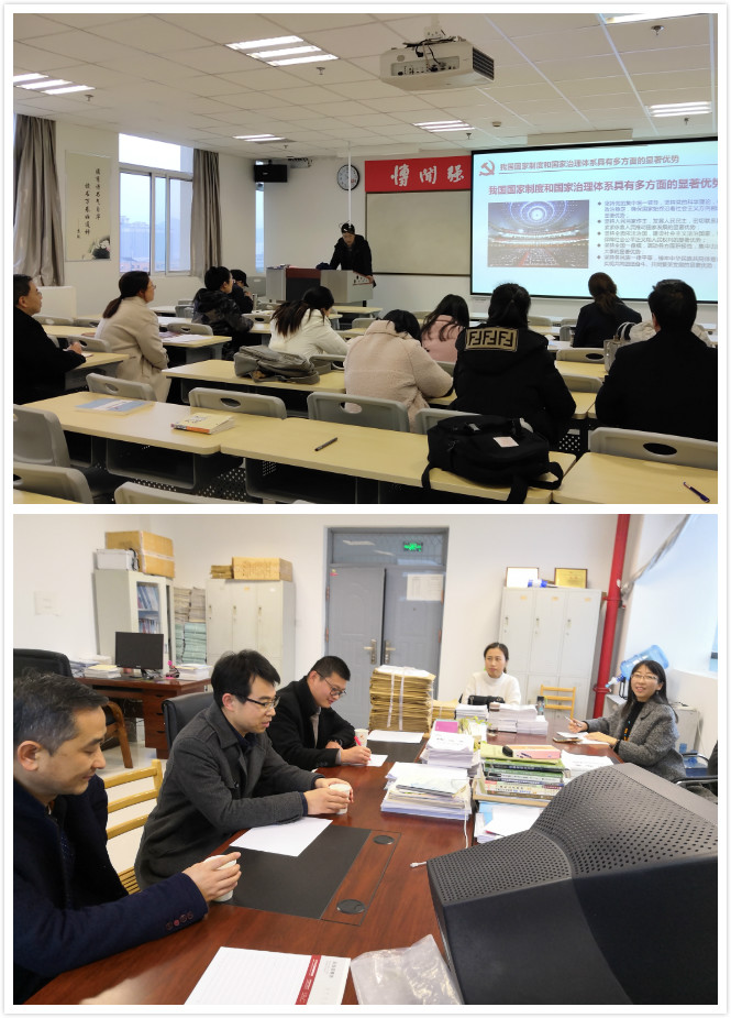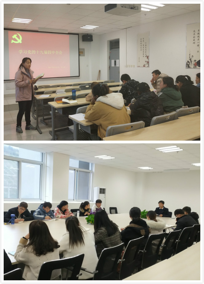 本次党日活动分为两个部分,第一部分:各支部书记从宗教工作的形势与任务,宗教工作在全局工作中的地位,如何正确认识与对待宗教,怎样做好高校的宗教工作四个方面进行了讲解,要求全体党员要自觉用习近平总书记的重要讲话精神武装头脑、指导实践,确保学校和谐安全稳定。第二部分:各支部书记带领大家一起学习了《中国共产党第十九届中央委员会第四次全体会议公报》,要求全体党员要迅速行动起来,把学习贯彻党的十九届四中全会精神作为当前和今后一个时期的重大政治任务,全面把握、深刻领会十九届四中全会的精神实质,作为教师党员要结合“不忘初心、牢记使命”主题教育,将党的十九届四中全会精神在广大师生中广泛宣传,将会议精神入脑入心,在工作实践中,坚持以社会主义核心价值观为引领,引导学生充分认识到中国特色社会主义制度的优越性,传承中华优秀传统文化,让制度自信和文化自信在学生群体中入脑入心入行;作为学生党员要把思想和行动统一到全会精神上来,积极发挥党员的先锋模范作用,深入学习专业知识,用专业知识武装头脑,并且贯彻落实到平常的生活中,做到学以致用,努力成为建设中国特色社会主义的坚实力量。