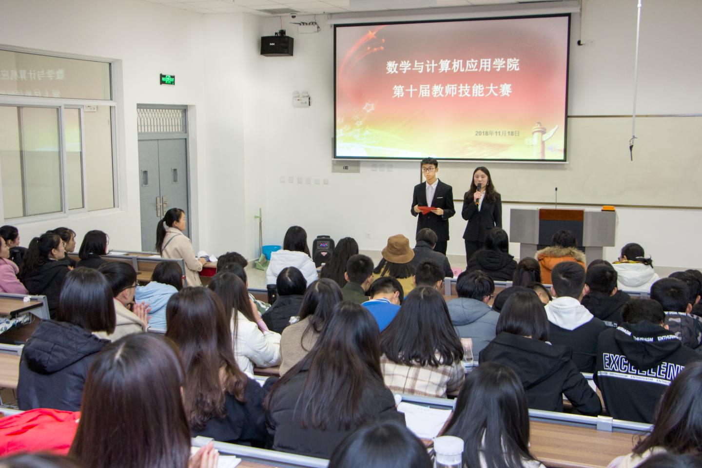 2018年11月18日晚7:00,我院在多媒体24成功举办了“第十届教师技能大赛决赛”,此次大赛为同学们搭建了自我展示和自我锤炼的舞台。数计学院学工办主任、团总支书记赵萍老师出席本次比赛,活动由刘亚亚、杨全、李会荣、罗俊丽、黄丽琼老师担任评委。我院2018级数学与应用数学专业全体同学参加本次活动。