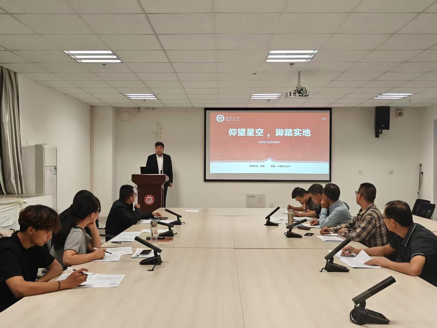 2025年9月18日19:00,数计学院在8-616会议室举行国家奖学金答辩评审会。本次评审会由学院党政领导班子成员、各系主任、教师代表、辅导员代表及学生代表共同组成评委团,对7名经年级专业推荐的优秀候选人进行公开评审。
