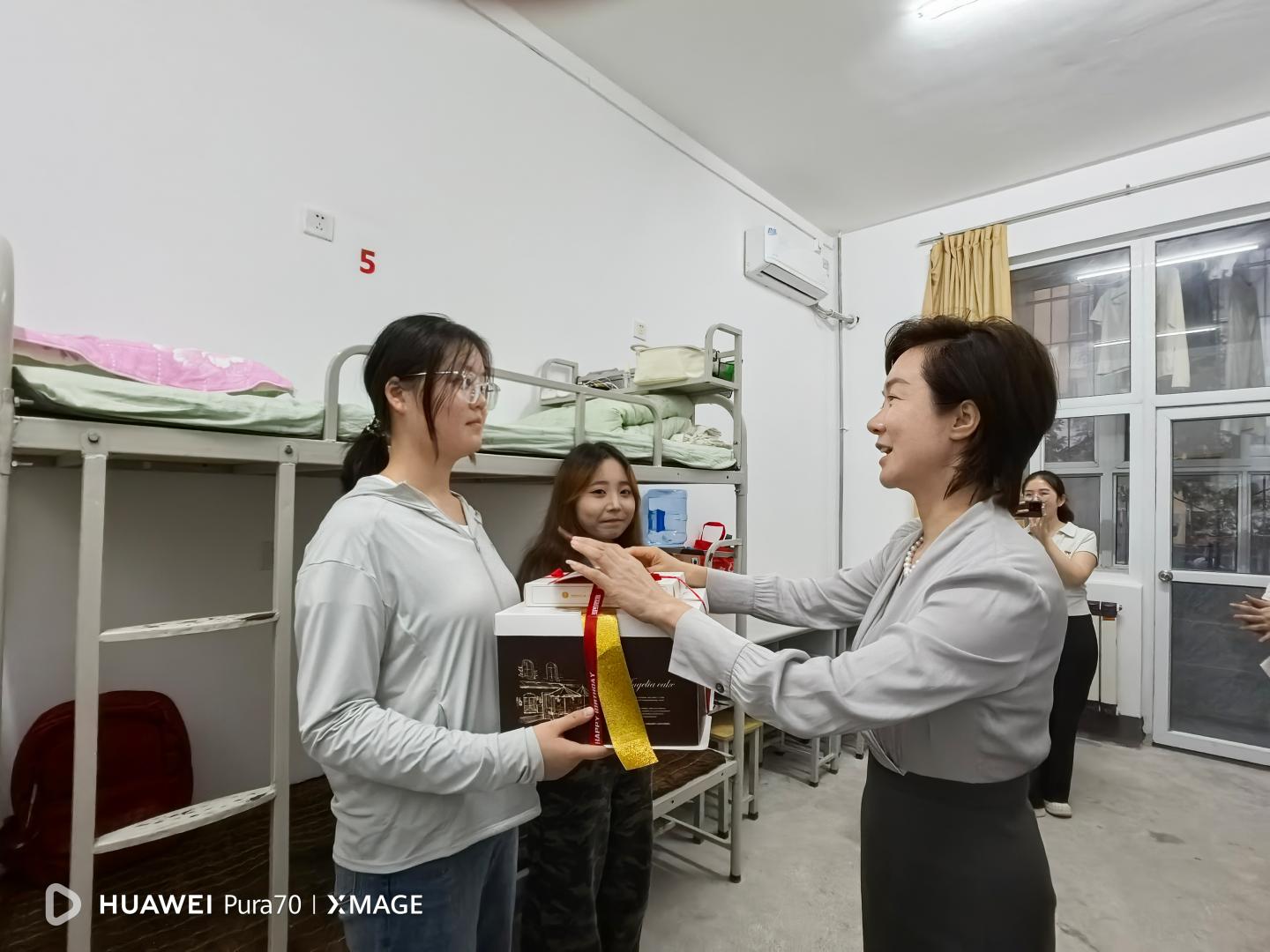 当晚19时许,程敏副校长一行来到11号新生宿舍,为当天过生日的2名同学送上惊喜。程敏副校长亲手为寿星们递上生日贺卡并送蛋糕,寄语道:“这是你们在大学的第一个生日,也是学校送给你们的“入学礼”,希望这份温暖能成为你们未来四年拼搏的动力。”