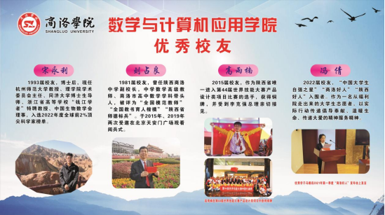 学院近年取得荣誉(部分) 招生专业介绍 数学与应用数学专业 培养目标 本专业立足商洛,适应陕西基础教育改革发展要求,培养德智体美劳全面发展,掌握数学科学及数学教育的基本知识和理论,具备运用数学知识、现代教育理论与技能解决实际问题的能力,具有数学教育教学创新意识和教师职业素养,能在中学、教育机构等部门从事教学、教研等方面工作的骨干教师。 学制与学位 基本学制:4年,授予理学学士学位。 课程设置 数学分析、高等代数、解析几何、概率论与数理统计、常微分方程、复变函数、实变函数、数学建模、近世代数、教育学、心理学、数学教育学、初等数学研究等。 计算机科学与技术专业 培养目标 本专业培养德智体美劳全面发展,掌握计算机领域的基本知识与理论,技术过硬,道德高尚,具备较强的创新精神和自主动手能力,具有较强的计算机应用素质,能在计算机相关行业从事计算机应用、软/硬件开发、网络设计与管理等工作的应用型人才。 学制与学位 基本学制:4年,授予工学学士学位。 课程设置 计算机导论、离散数学、模拟与数字电子技术、C语言程序设计、线性代数、汇编语言程序设计、算法与数据结构、概率论与数理统计、操作系统、计算机网络、面向对象程序设计、计算机组成原理、数据库开发与应用、网页与网站设计、微机原理与接口技术、软件工程等。 网络工程专业 培养目标 本专业培养德智体美劳全面发展,具有创新精神,知识素养和能力素养协调发展,掌握计算机基础知识和网络工程专业知识和专业思维,具备网络系统规划与设计、部署与实施、分析与测试、运维及管理以及应用系统设计与开发等方面的工程实践能力,具备团队协作、终身学习、国际交流的能力,能在企事业单位和其他各行各业的网络信息技术部门从事网络规划与设计、网络应用系统集成与网络应用开发、网络运维与管理及网络安全防范的应用型人才。 学制与学位 基本学制:4年,授予工学学士学位。 课程设置 网络工程专业导论、C语言程序设计、离散数学、算法与数据结构、模拟与数字电子技术、线性代数、汇编程序设计与微机接口、概率论与数理统计、信息安全基础、数据库原理与应用、计算机网络、计算机组成原理、面向对象与Java程序设计、操作系统、路由与交换技术、网络规划与设计、Web程序设计等。 数据科学与大数据技术专业 培养目标 本专业培养德智体美劳全面发展,掌握信息与计算科学、数据科学所需要的数学、计算机科学等相关学科的基础理论与基本方法,具备大数据分析与应用的基础知识和大数据工程项目的设计和开发能力,可在科研院所、政府机关、互联网企业、信息技术等企事业单位从事数学建模、大数据统计分析、大数据应用开发、云计算等工作,也可以选择到国内外相近学科的教学或研究单位继续深造,具有良好的数学思维能力、大数据视野、人文素养和创新精神的高素质应用型人才。 学制与学位 基本学制:4年,授予工学学士学位。 课程设置 C语言程序设计、Python程序设计、Java面向对象的程序设计、数据库原理与应用、离散数学、云计算与大数据技术、数据结构与算法分析、开源大数据平台技术基础、大数据分析实践、数据分析理论与实践、数据仓库原理与实践、数据挖掘等。 商洛学院数学与计算机应用学院欢迎您!