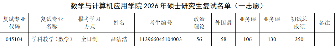 数学与计算机应用学院2026年硕士研究生复试名单(一志愿)